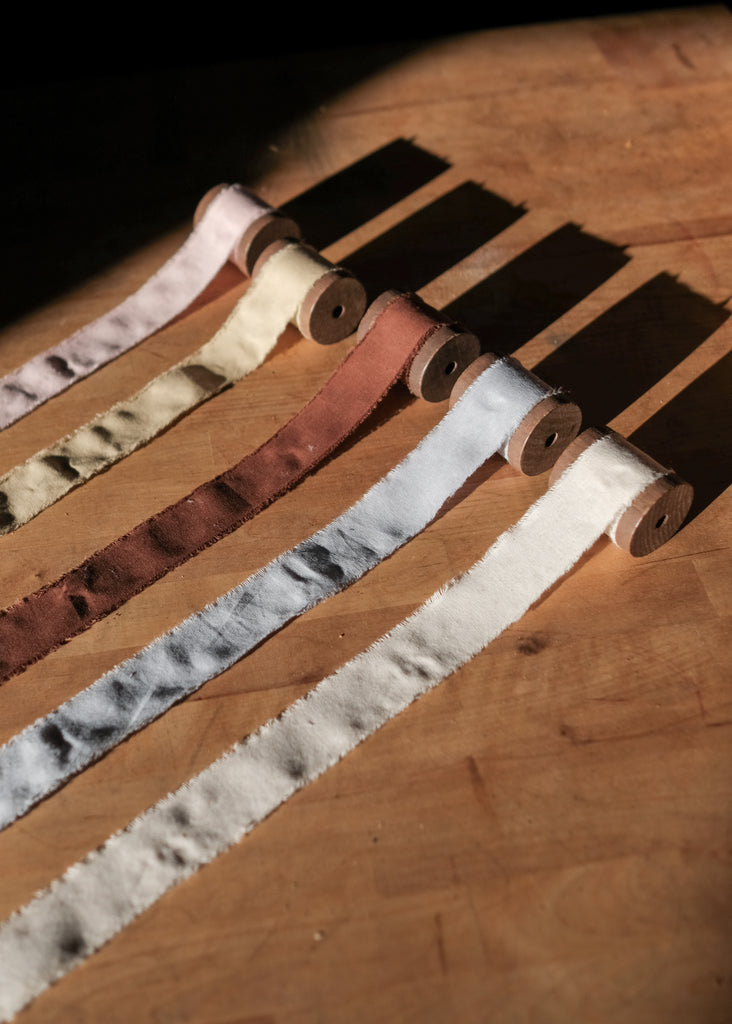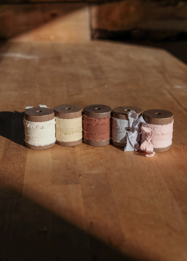 You can also add on an elegant touch to your flower box with our ribbon. Made from a cotton-linen blend, each 1.5” wide ribbon is carefully wound onto a beautiful wooden spool, offering 5 yards of timeless charm. With five stunning colors to choose from, these ribbons are the perfect way to finish a bouquet.