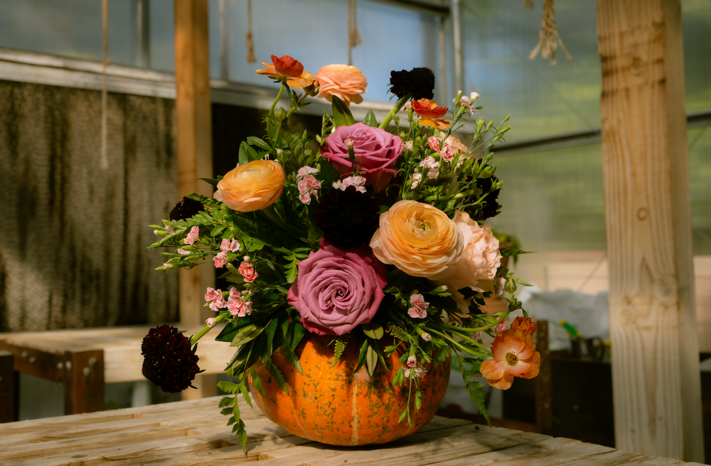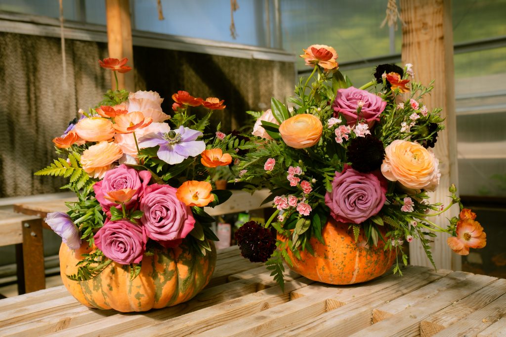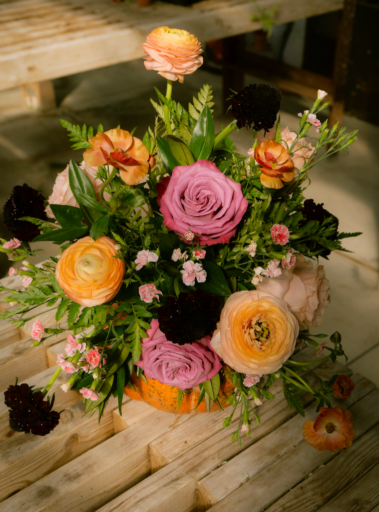 Celebrate the magic of October with our October Flower Box, a spellbinding blend of moody hues and autumn warmth. Inspired by the mystery of Halloween and the glow of the harvest season, this month’s arrangement features purple anemones, peach and violet roses, orange butterfly ranunculus, dark purple scabiosa, and peach ranunculus. Together, these blooms create an enchanting palette that captures the charm of crisp evenings, flickering candlelight, and the allure of fall’s most festive month.